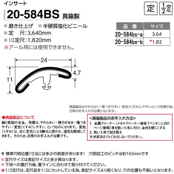 真鍮製 ■磨き仕上げ ■半硬質塩化ビニール ■定尺:3,640mm ■1/2定尺:1,820mm ※アール用には使用できません。