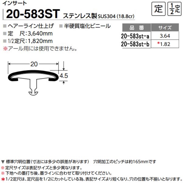 ステンレス製SUS304(18.8cr) ■ヘアーライン仕上げ ■半硬質塩化ビニール ■定尺:3,640mm ■1/2定尺:1,820mm ※アール用には使用できません。